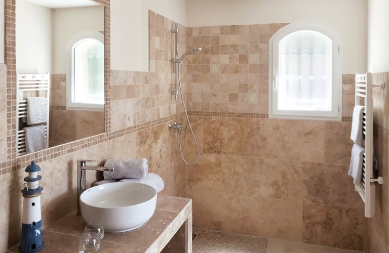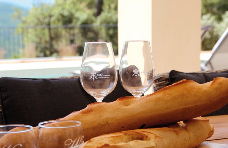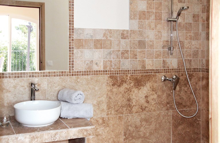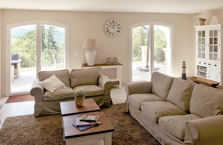 On the pool level you will also find a covered terrace where you can dine with all the guests. The heated pool is surrounded by spacious terraces with accompanying luxury sun loungers and parasols where you can relax and enjoy a panoramic view of the Provencal hinterland. The pool is secured with infrared alarm and the access to the pool can be closed with a gate for small children. The grounds are beautifully landscaped with trees and plants and are fully fenced. The entrance to the villa has an automatic gate and there is ample parking for several cars.