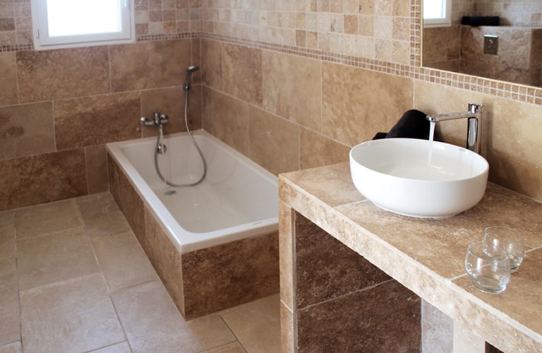 The living area is spread over three floors of which the main living area is wheelchair accessible. Villa Athos has a spacious open plan living/dining area with a fully equipped open plan kitchen. In the hallway closet you will find a washing machine and dryer. At the front there is the large covered terrace with dining table for 14 people and high quality furniture. Divided over the floors are seven comfortably furnished bedrooms (most of which have air conditioning) and six bathrooms.