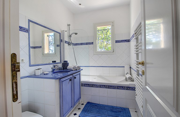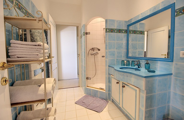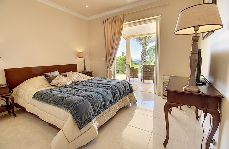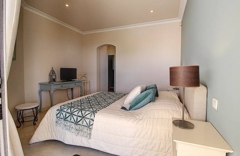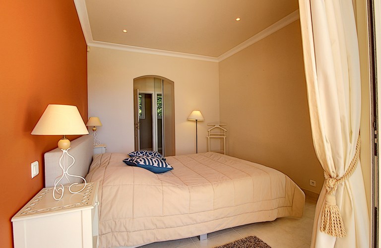 De zes slaapkamers zijn elegant ingericht en bieden veel comfort. Vijf ervan zijn voorzien van airconditioning en hebben een eigen badkamer. Twee kamers hebben directe toegang tot het grote zonneterras op de bovenverdieping. De zesde slaapkamer ligt op tuinniveau en is eenvoudiger ingericht, maar blijft aangenaam koel – perfect voor een middagdutje na een duik in het zwembad.
