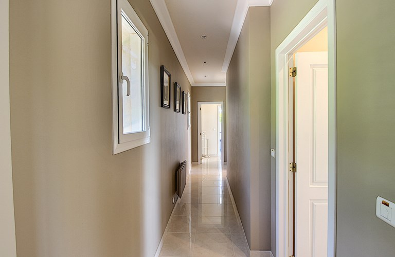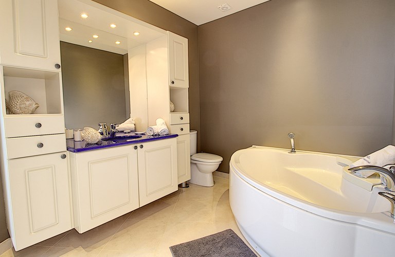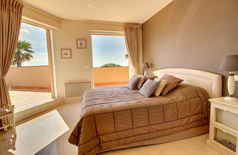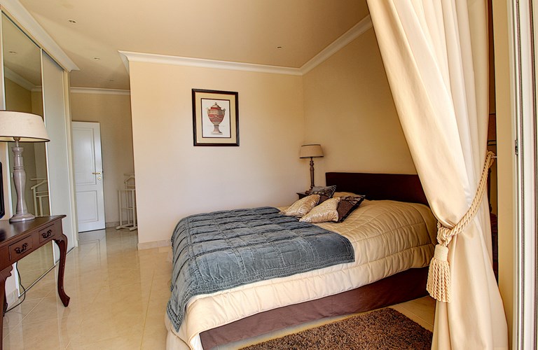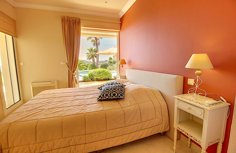 Op de begane grond bevinden zich drie slaapkamers, waarvan één met een kingsize bed en een ensuite badkamer met bad en toilet. De andere twee kamers hebben eveneens een schuifpui naar buiten en delen een badkamer met douche en toilet. Een extra apart toilet is hier ook aanwezig. Op de bovenverdieping zijn nog twee slaapkamers, elk met een tweepersoonsbed, airconditioning, schuifpui en eigen badkamer. De zesde slaapkamer bevindt zich op het tuinniveau, naast de garage. Deze kamer heeft een tweepersoonsbed en een eigen badkamer met douche en toilet. In totaal zijn er vijf toiletten, waarvan vier geïntegreerd in een badkamer.