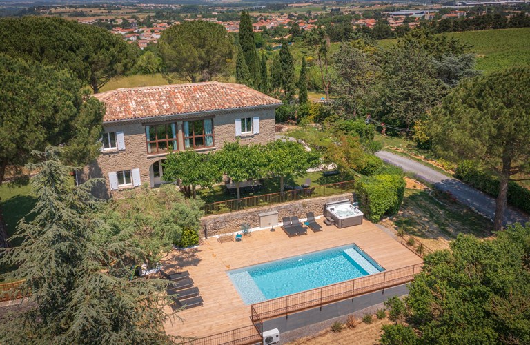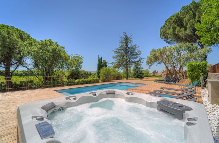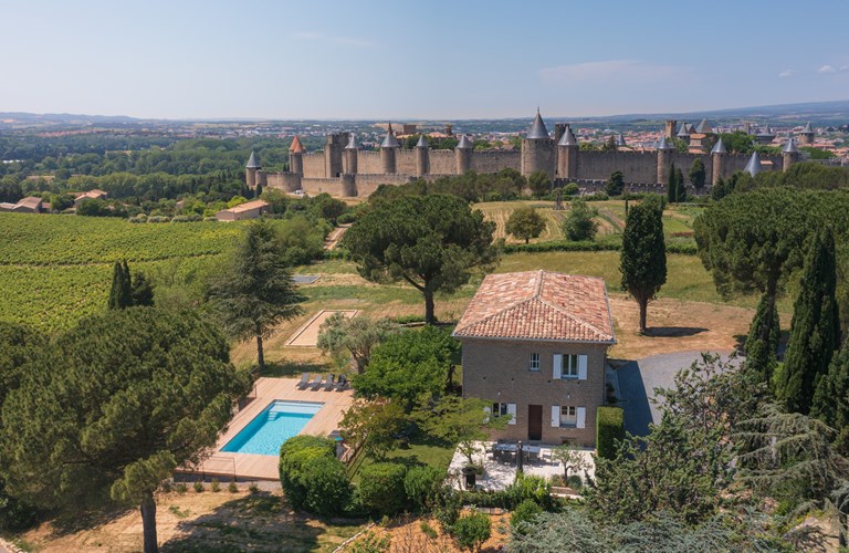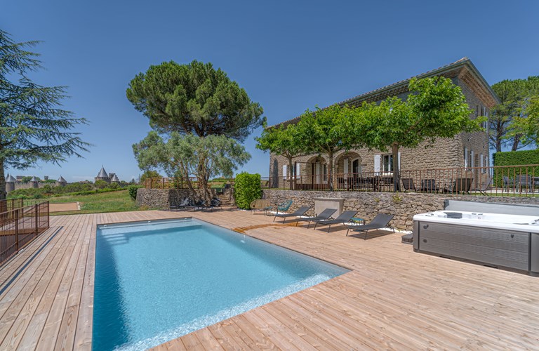 Dit prachtige stenen huis met airconditioning is gelegen in een natuurgebied zonder buren en biedt comfortabel plaats aan 12 personen. . U bewoont het gehele pand privé. Verder vindt u een verwarmd, beveiligd zwembad met zoutbehandeling, een buitendouche, jacuzzi, ligstoelen op het houten terras van 100m2 met fabelachtig uitzicht op de Cité en de Pyreneeën. Het terras is verder voorzien van tuinmeubelen, BBQ en vuurkorf. Het terrein is afgesloten met een automatische poort en er zijn talrijke parkeerplaatsen op het domein als ook een elektrisch oplaadpunt van 11kW.