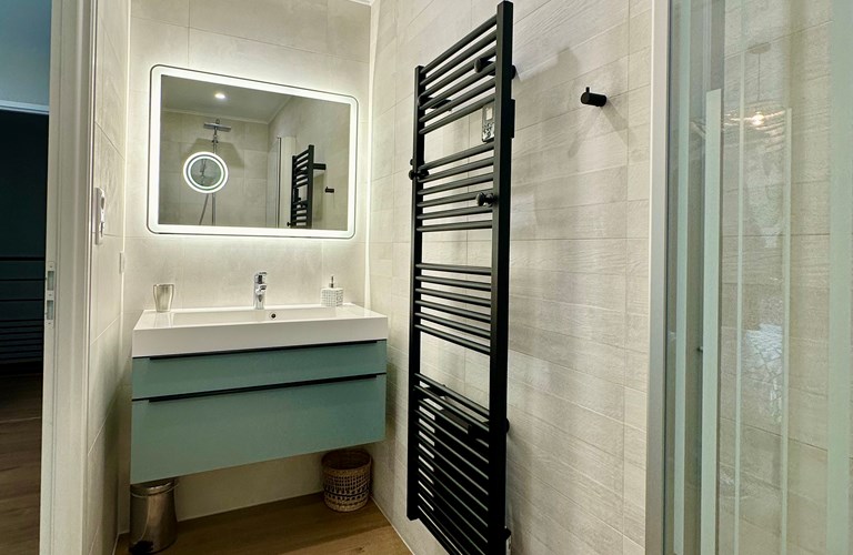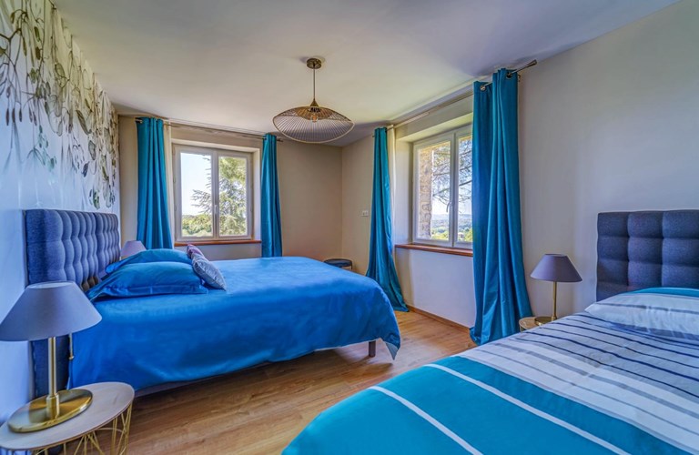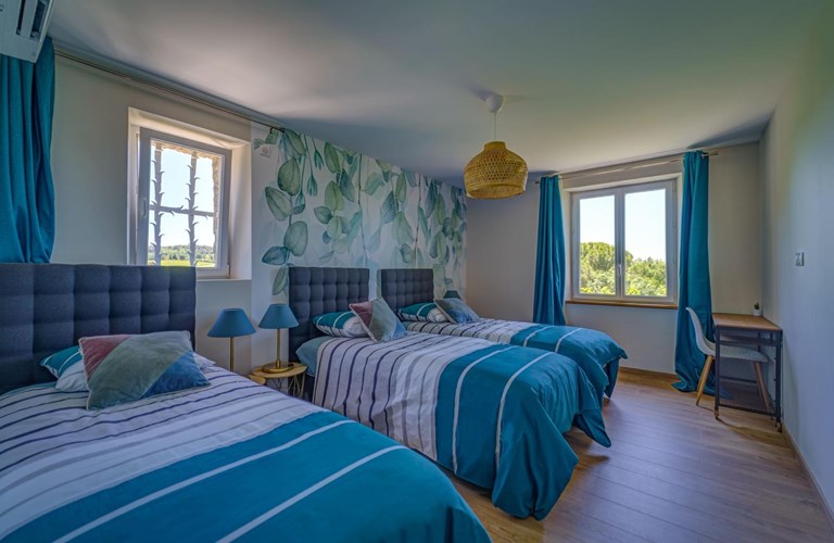 Op de etage (voorzien van airconditioning) bevinden zich de twee 3-persoonsslaapkamers en twee 2-persoonsslaapkamers allen voorzien van eigen badkamers.