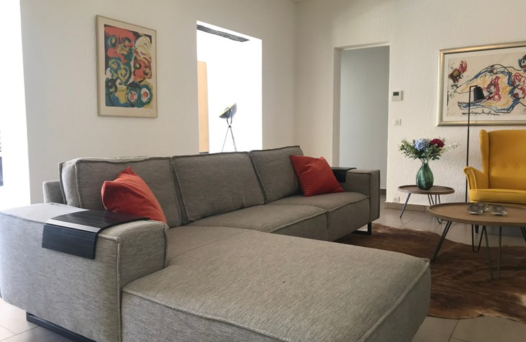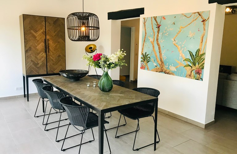 In deze fraaie en lichte woning bevinden alle vertrekken en slaapkamers zich gelijkvloers op de begane grond. De hedendaagse living heeft een kleurrijke en sfeervolle inrichting met een comfortabele zithoek. In het verlengde bevindt zich de eetkamer met een 6 persoons eettafel en openslaande deuren die toegang bieden naar het terras met zwembad.