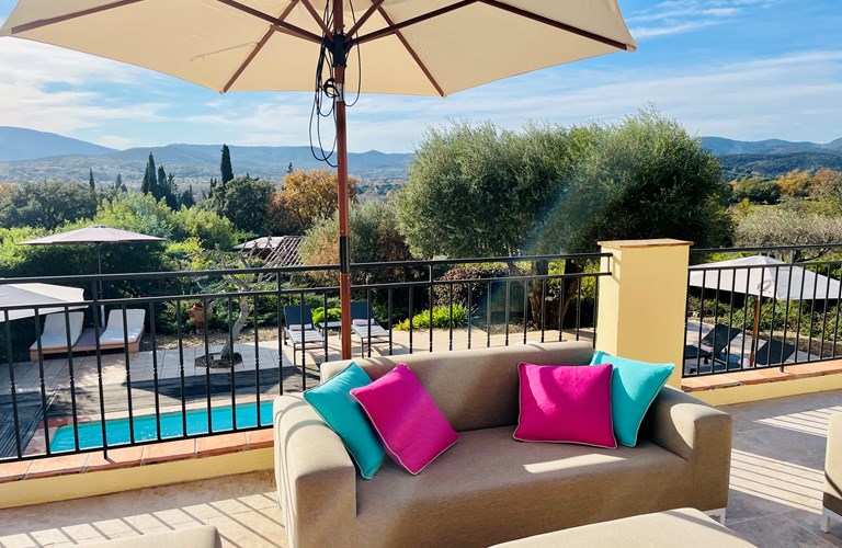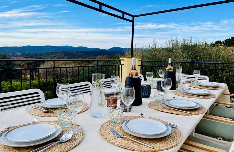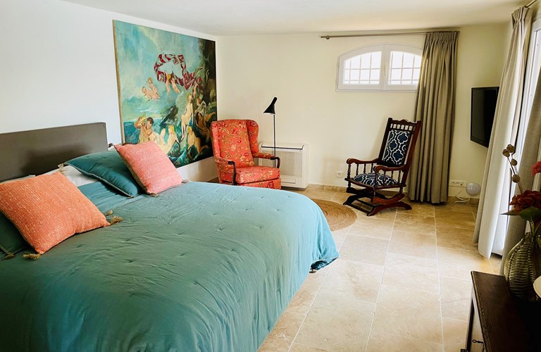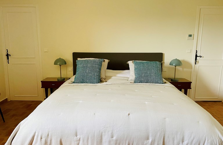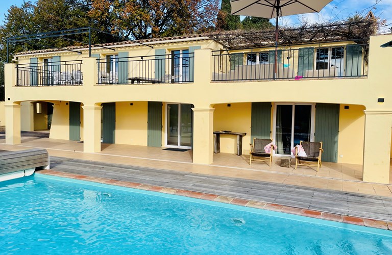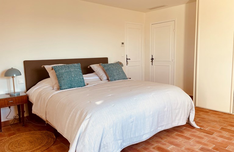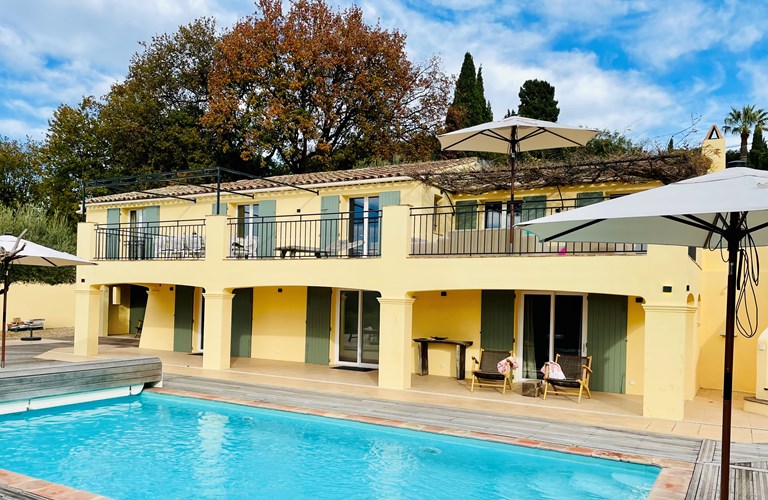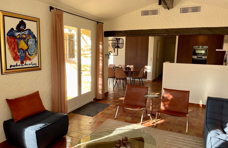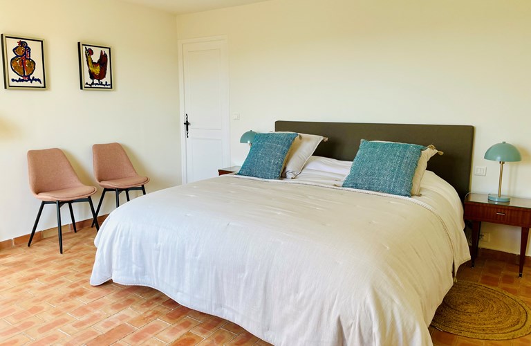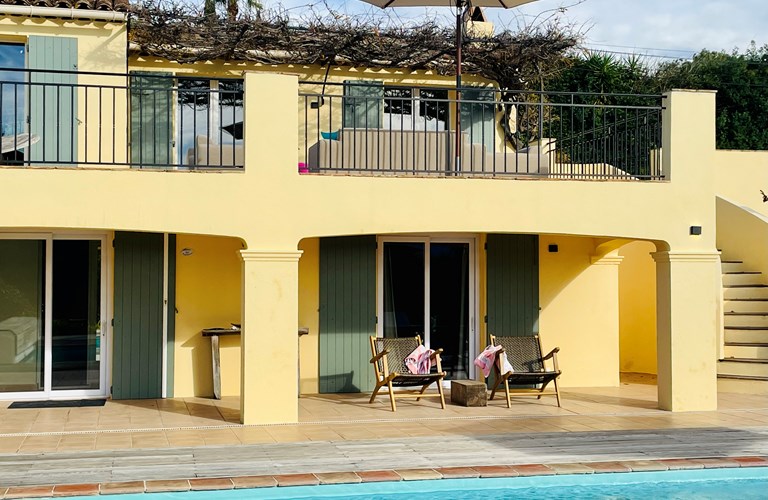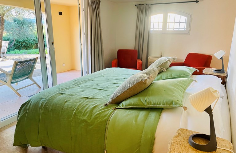 De hoofdwoning is verdeeld over twee verdiepingen (zonder interne verbinding) die via het terras met een trap langs de buitenkant verbonden zijn. Er bevinden zich twee slaapkamers op de etage en twee appartementen op de begane grond. De 5e slaapkamer bevindt zich in een losstaande gîte. Alle slaapkamers zijn voorzien van kingsize bedden (180×200) en airconditioning. Het perceel is volledig omheind en heeft een automatische poort met plaats om 4 auto’s te parkeren. De etage herbergt de woonkamer, de eetkamer, een luxe en volledig ingerichte keuken als ook de master suite met en-suite badkamer. Tevens een 2e slaapkamer met badkamer en apart toilet beschikkend over een groot terras met magnifiek uitzicht over de omgeving en op het Kasteel van Grimaud. Op het terras staat een grote eettafel voor 10 personen voor sfeervolle lunches en diners, een grote lounge hoek en een gas barbecue. De keuken is modern en compleet ingericht en beschikt o.a. over een oven, magnetron, vaatwasser, een hoge koelkast met apart diepvriesvak, inductiekookplaat, Nespresso koffiemachine en een waterkoker.
