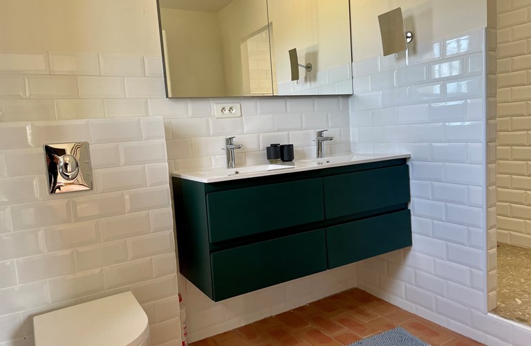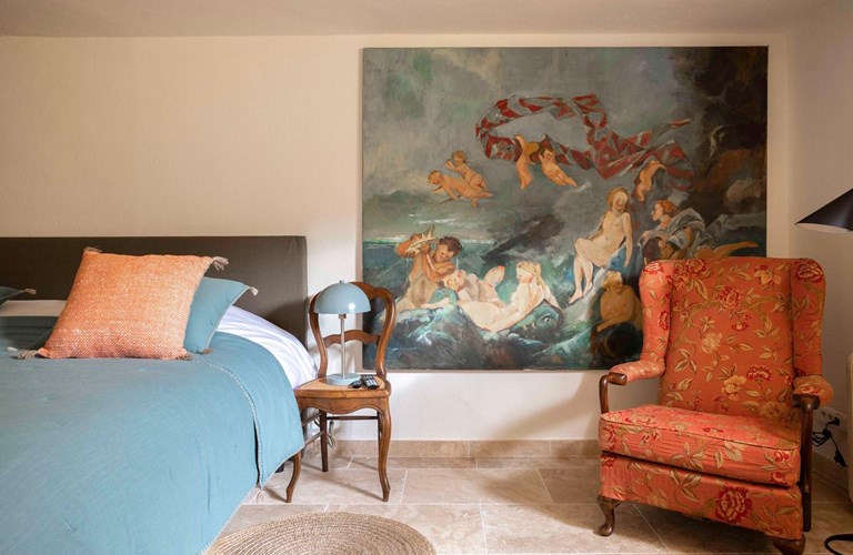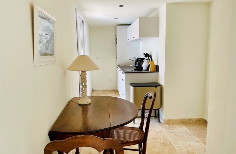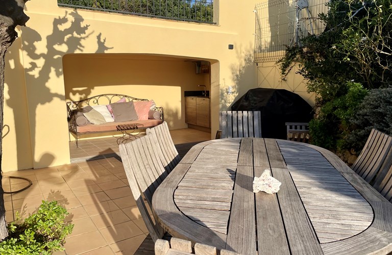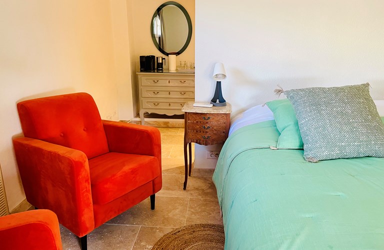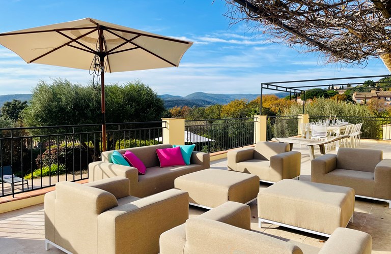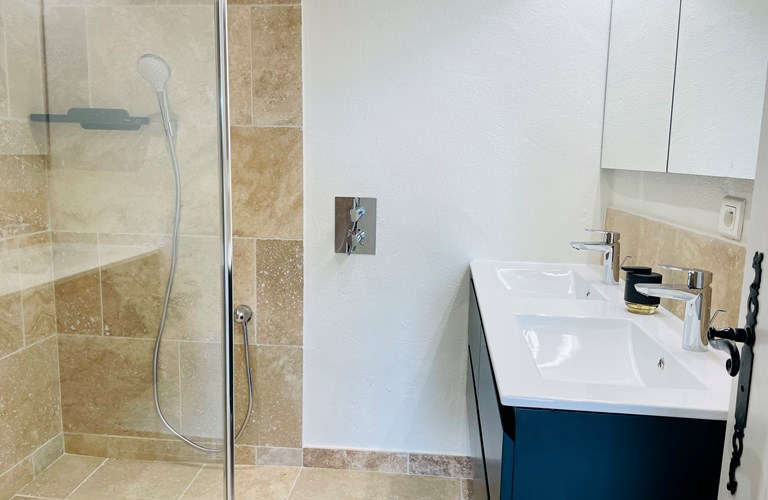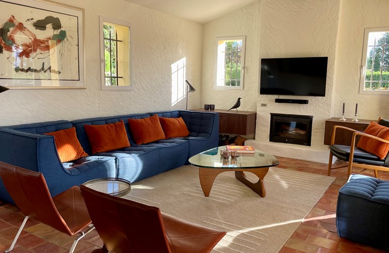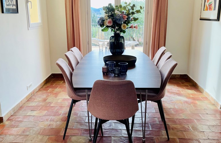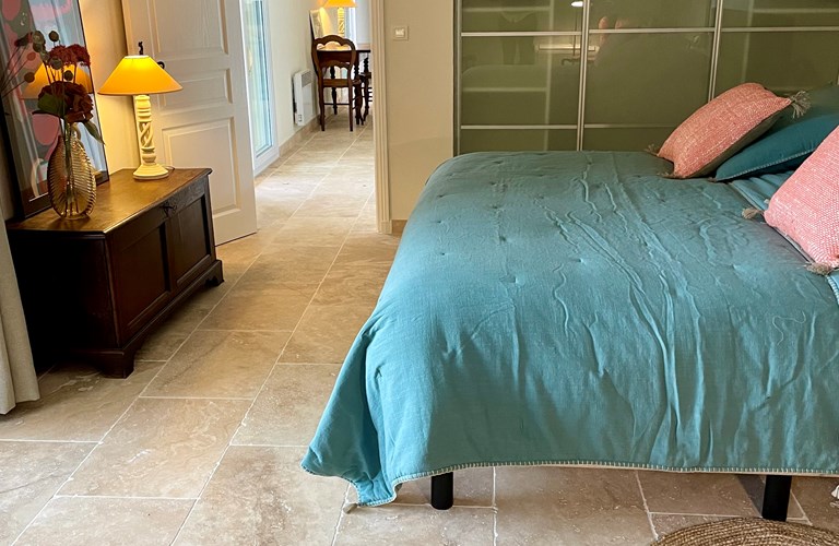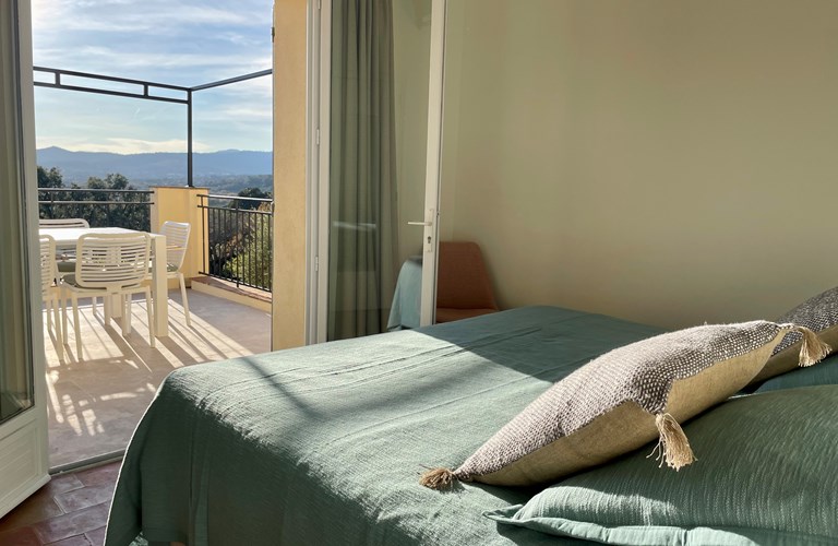 De hoofdwoning is verdeeld over twee verdiepingen (zonder interne verbinding) die via het terras met een trap langs de buitenkant verbonden zijn. Er bevinden zich twee slaapkamers op de etage en twee appartementen op de begane grond. De 5e slaapkamer bevindt zich in een losstaande gîte. Alle slaapkamers zijn voorzien van kingsize bedden (180×200) en airconditioning. Het perceel is volledig omheind en heeft een automatische poort met plaats om 4 auto’s te parkeren. De etage herbergt de woonkamer, de eetkamer, een luxe en volledig ingerichte keuken als ook de master suite met en-suite badkamer. Tevens een 2e slaapkamer met badkamer en apart toilet beschikkend over een groot terras met magnifiek uitzicht over de omgeving en op het Kasteel van Grimaud. Op het terras staat een grote eettafel voor 10 personen voor sfeervolle lunches en diners, een grote lounge hoek en een gas barbecue. De keuken is modern en compleet ingericht en beschikt o.a. over een oven, magnetron, vaatwasser, een hoge koelkast met apart diepvriesvak, inductiekookplaat, Nespresso koffiemachine en een waterkoker.