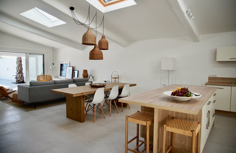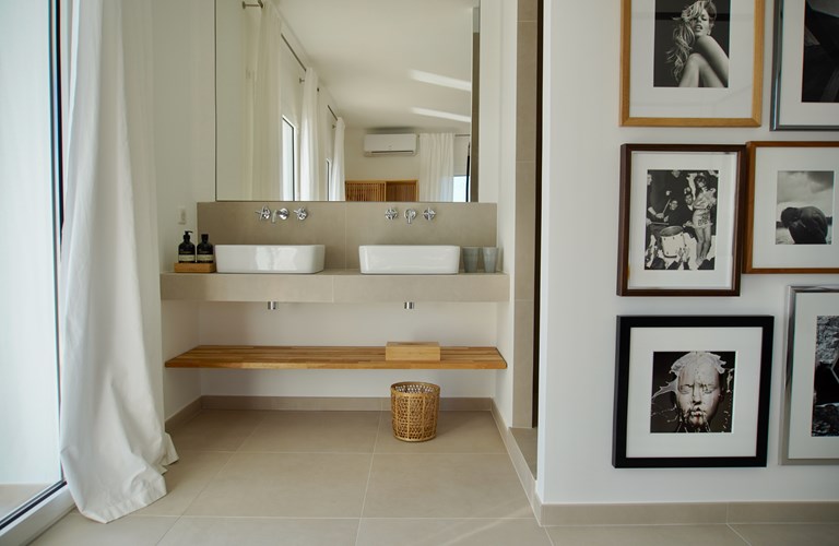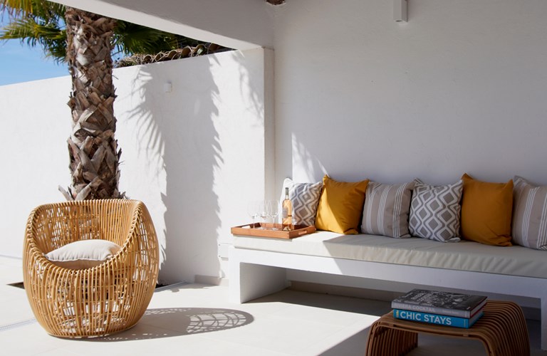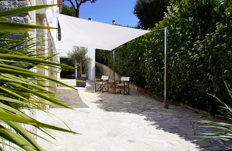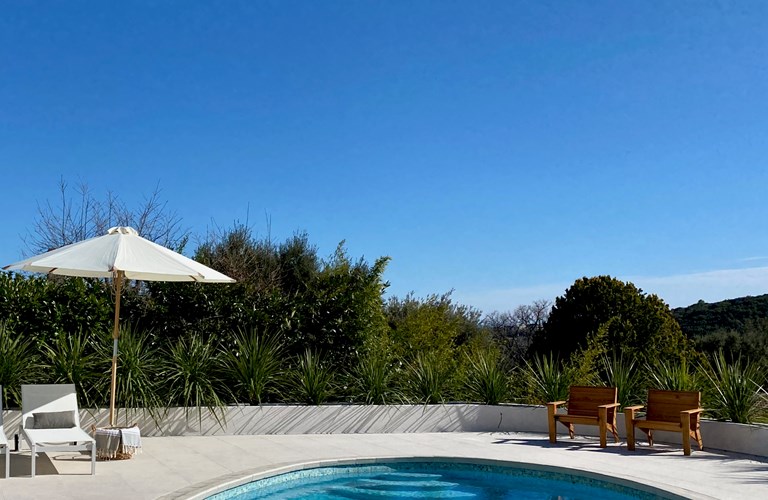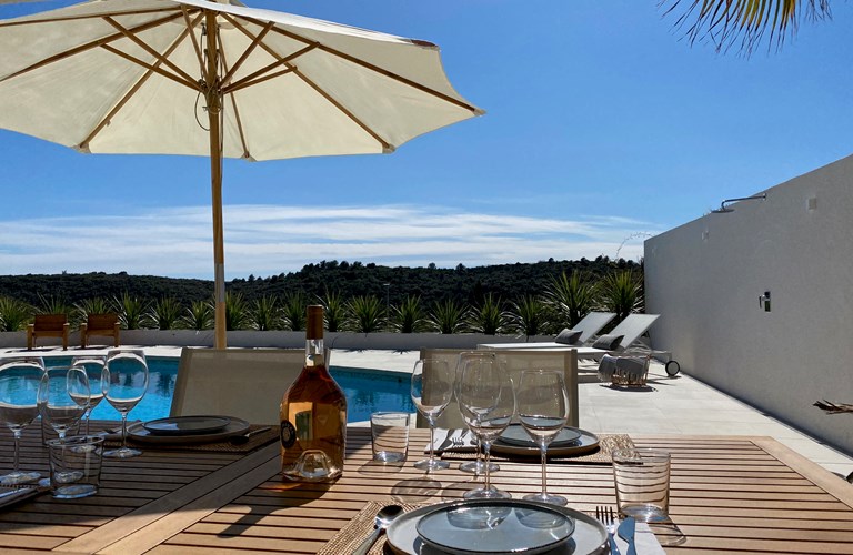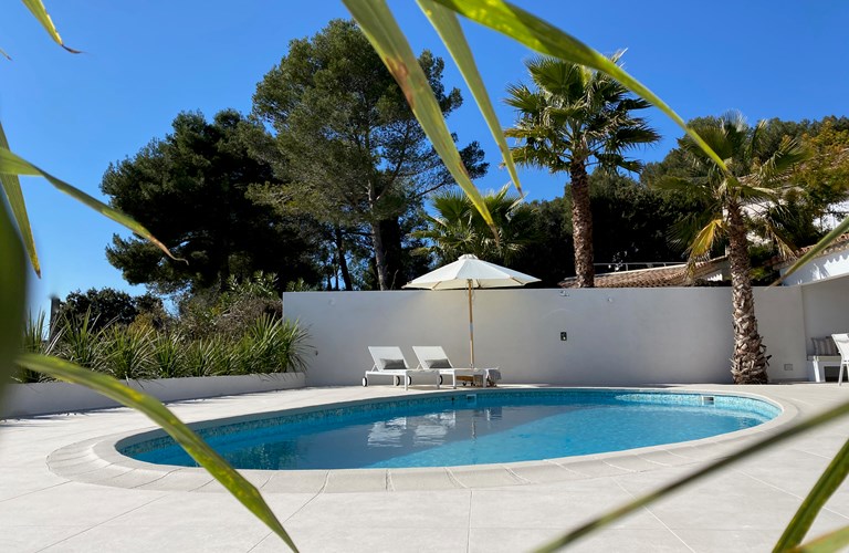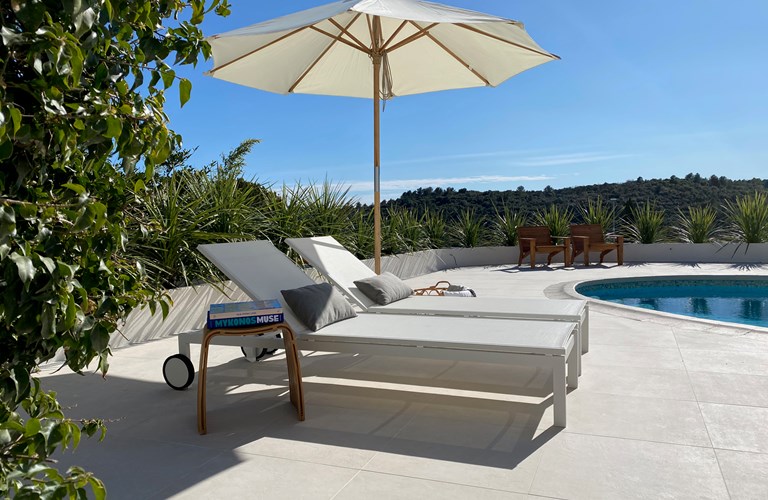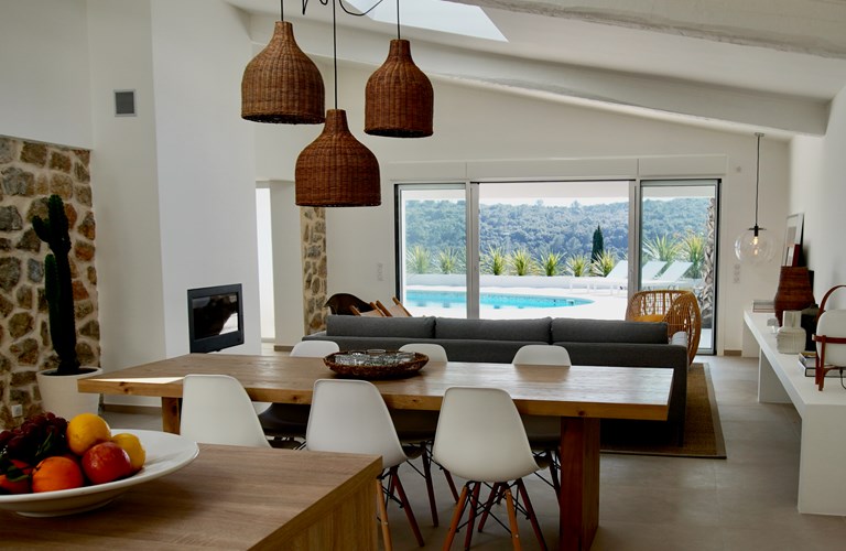 Grote dennen- en palmbomen zorgen buiten voor de mediterrane sfeer en vormen samen met de witte stenen muren van de villa, een sfeervolle plek voor dineren. Het uitzicht op het mooie zwembad en de heuvels daarachter is daarbij een mooie bonus. In de avonden met een glas goede rosé geniet u van de sfeervolle verlichting die voor de juiste ambiance zorgt.